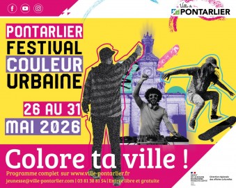Pontarlier Festival Couleur Urbaine À Pontarlier, la créativité des jeunes prend le pouvoir ! Du 26 au 31 mai, le Pontarlier Festival Couleur Urbaine fait vibrer la ville.