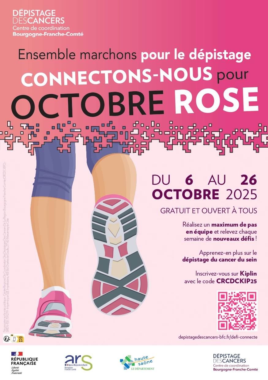 - Du 6 au 26 octobre 2025, participez en équipe à un défi connecté en Bourgogne-Franche-Comté à l’occasion d’Octobre Rose. L’objectif : réaliser en équipe un maximum de pas et, pour les plus motivés, relever chaque semaine différents challenges. En équipe, chacun de vos pas vous rapportera des points et vous en apprendrez plus sur le dépistage du cancer du sein et sur la prévention de ce cancer. Proposé par le CRCDC-BFC, ce défi est gratuit et ouvert à tous, les inscriptions sont ouvertes dès à présent. Rendez-vous sur : https://www.depistagedescancers-bfc.fr/defi-connecte !