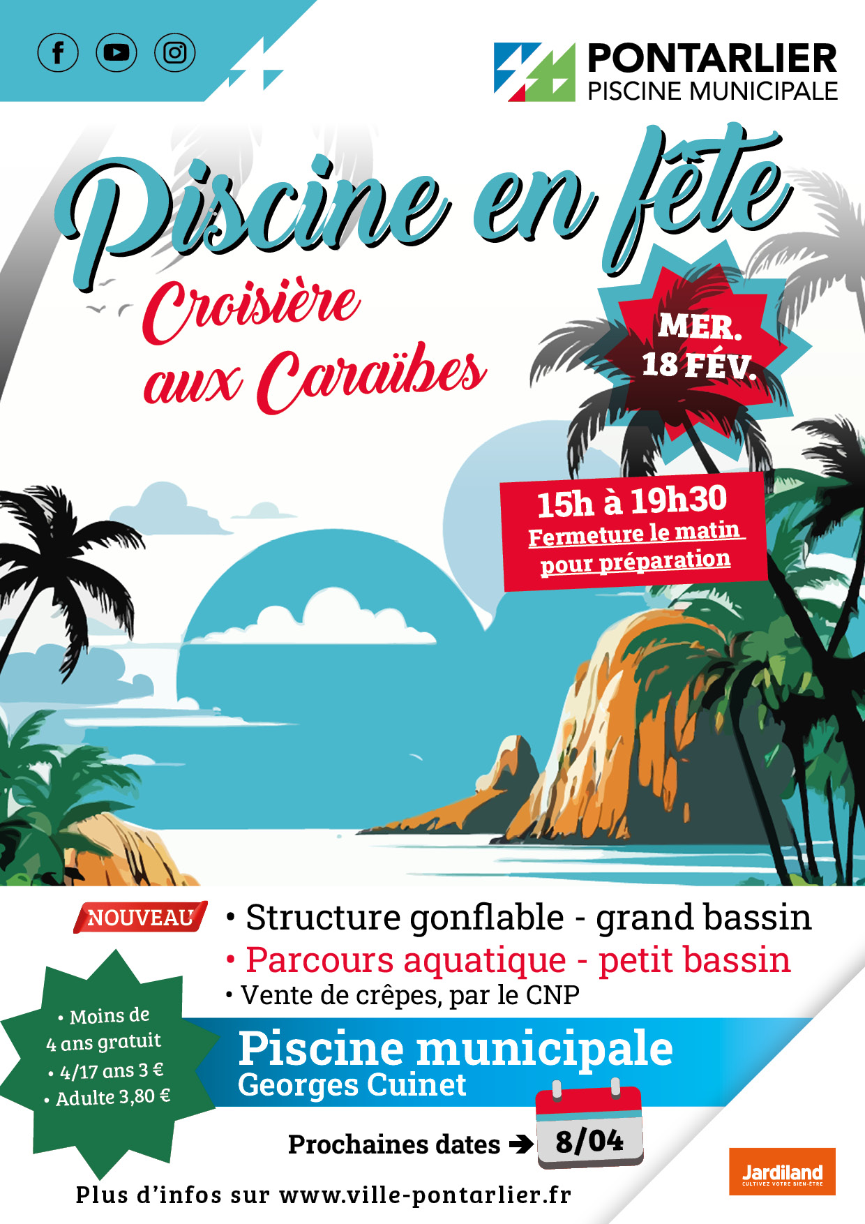 Dates des prochaines piscines en fête : Mercredi 08 avril 2026, Mercredi 21 octobre 2026, Mercredi 23 décembre 2026