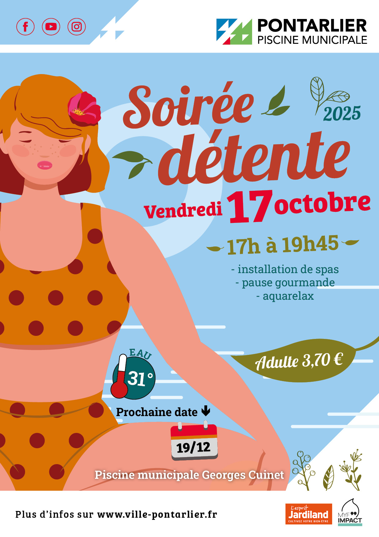 Soirées de détente et de bien-être proposées chaque vendredi précédant les petites vacances scolaires : température des bassins de 29 à 32°C, aquabikes en accès libre, Jacuzzis, plages aménagées, salon de détente, tisanerie et animations en rapport avec la thématique.
