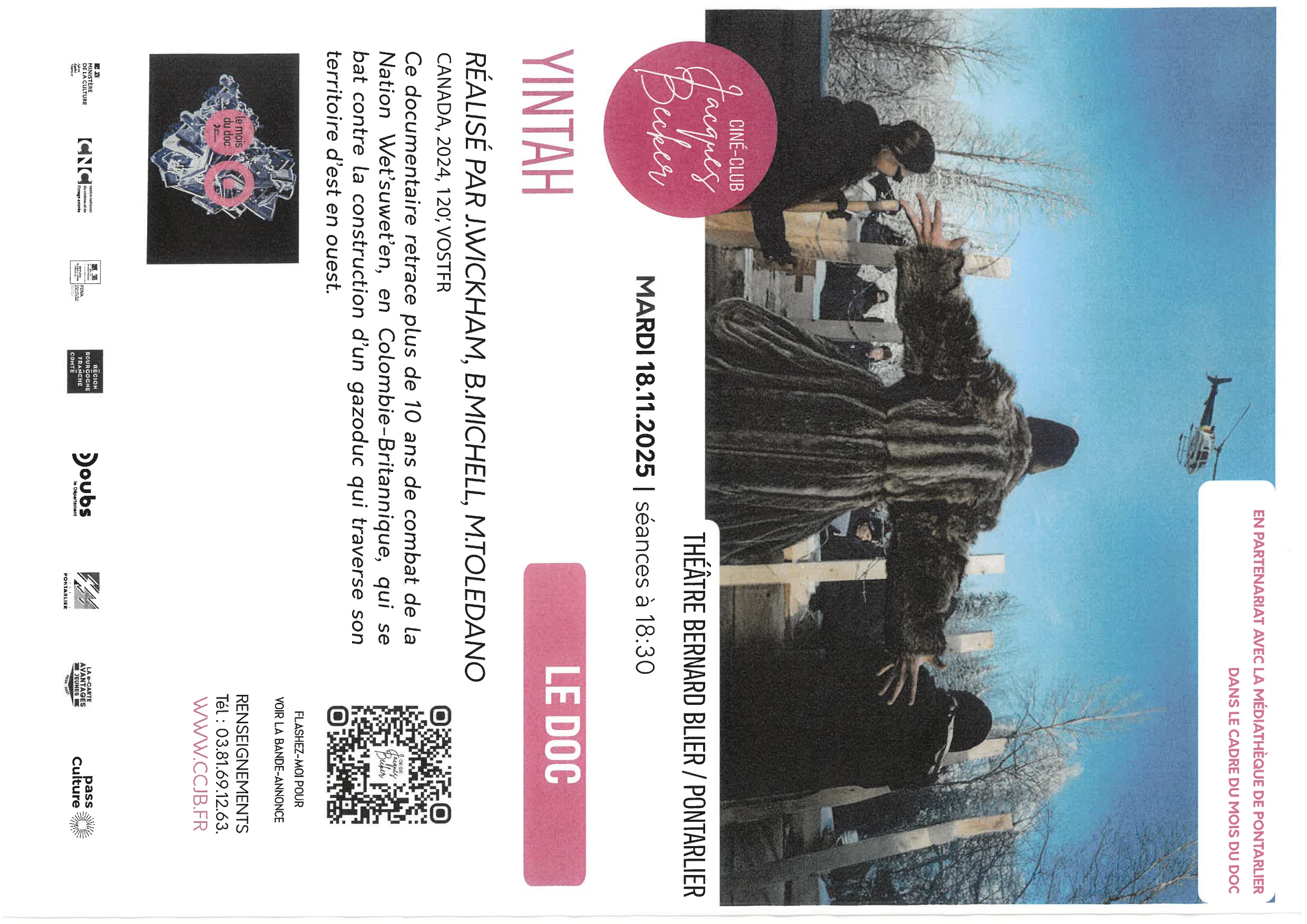 Dans le cadre du Mois du Doc, venez assister à la projection du documentaire Yintah suivie d’un ciné-débat animé par Durable et Doubs. Public adulte. Grat...