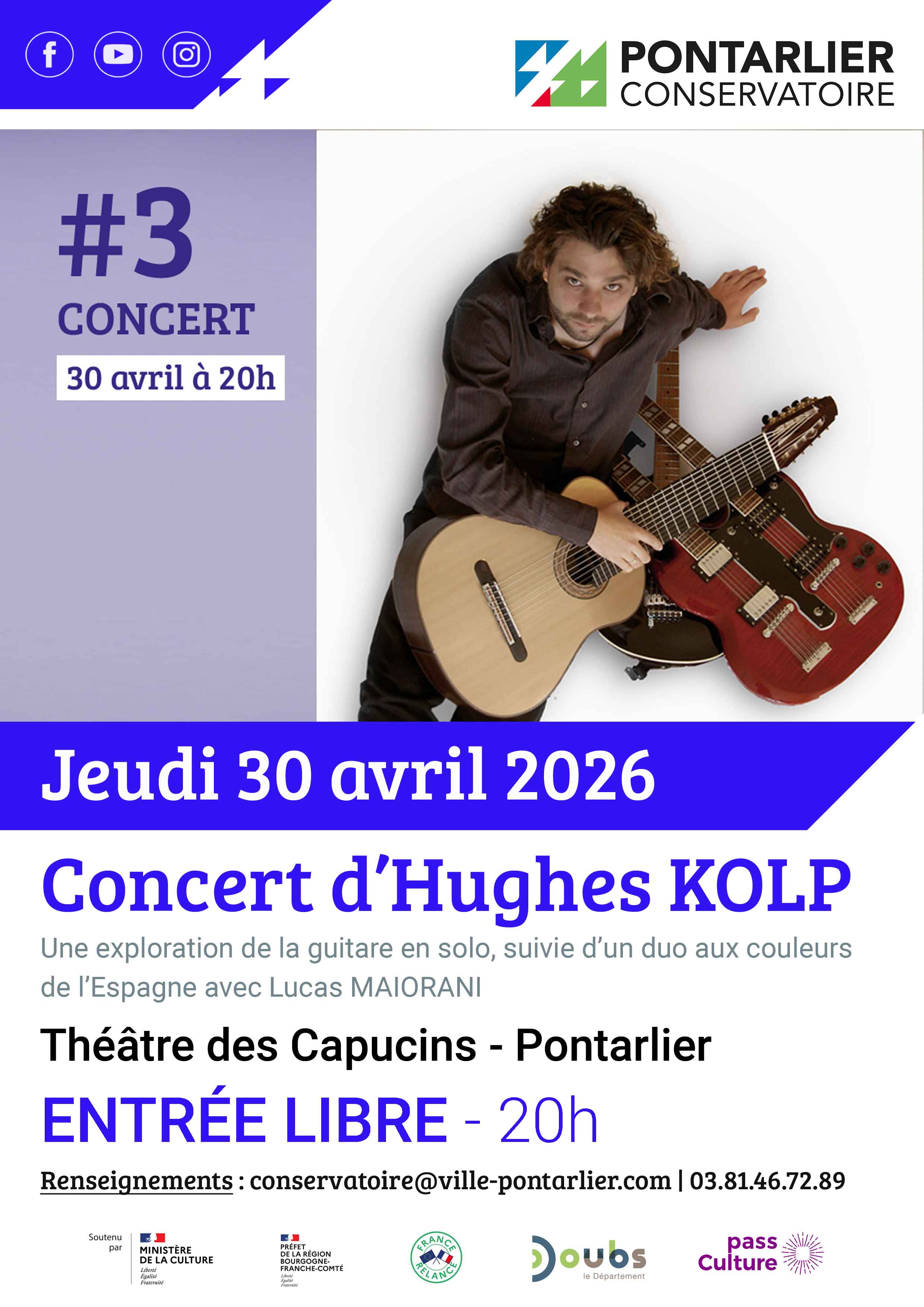 Venez assister à la Masterclass guitare donnée aux élèves du Conservatoire par Hughes KOLP. Perfectionnement des pièces jouées par les jeunes musiciens, des conseils ...
